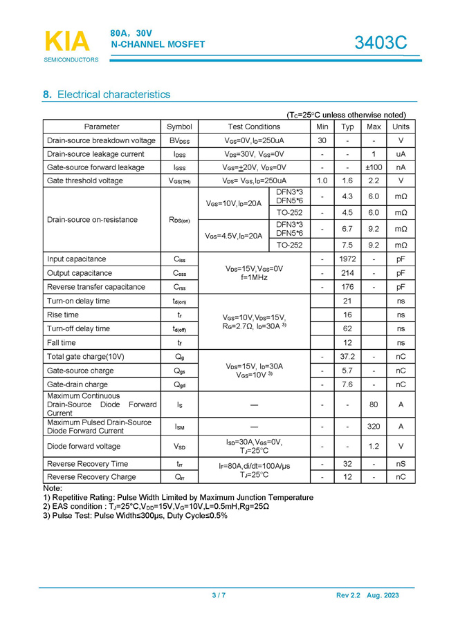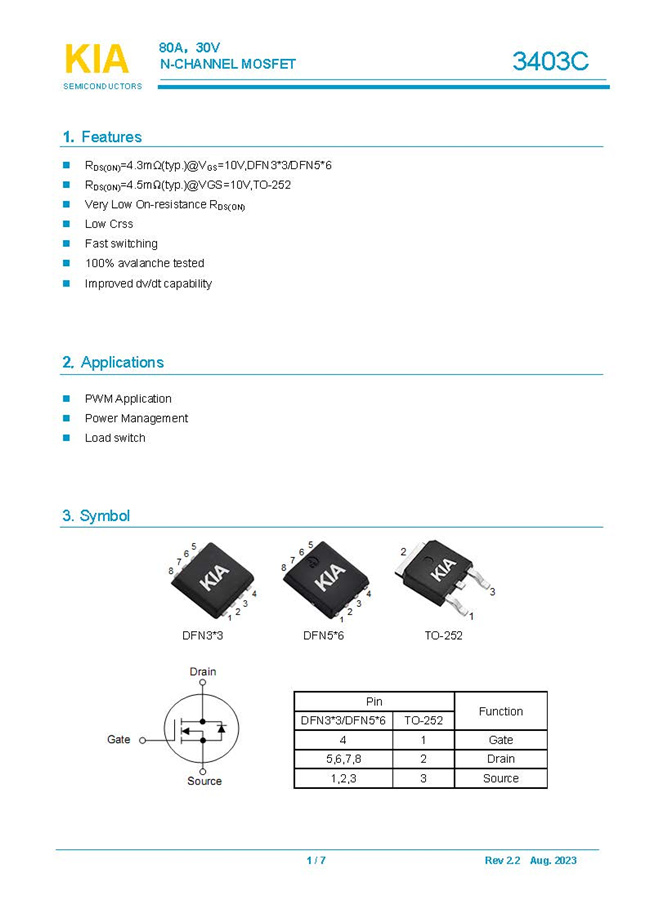參數(shù): ID(A): 80 BVDSS(V): 30 RDS(ON): 4.3 Qg(nC): 37.2 Package: TO-252.DFN3*3.DFN5*6