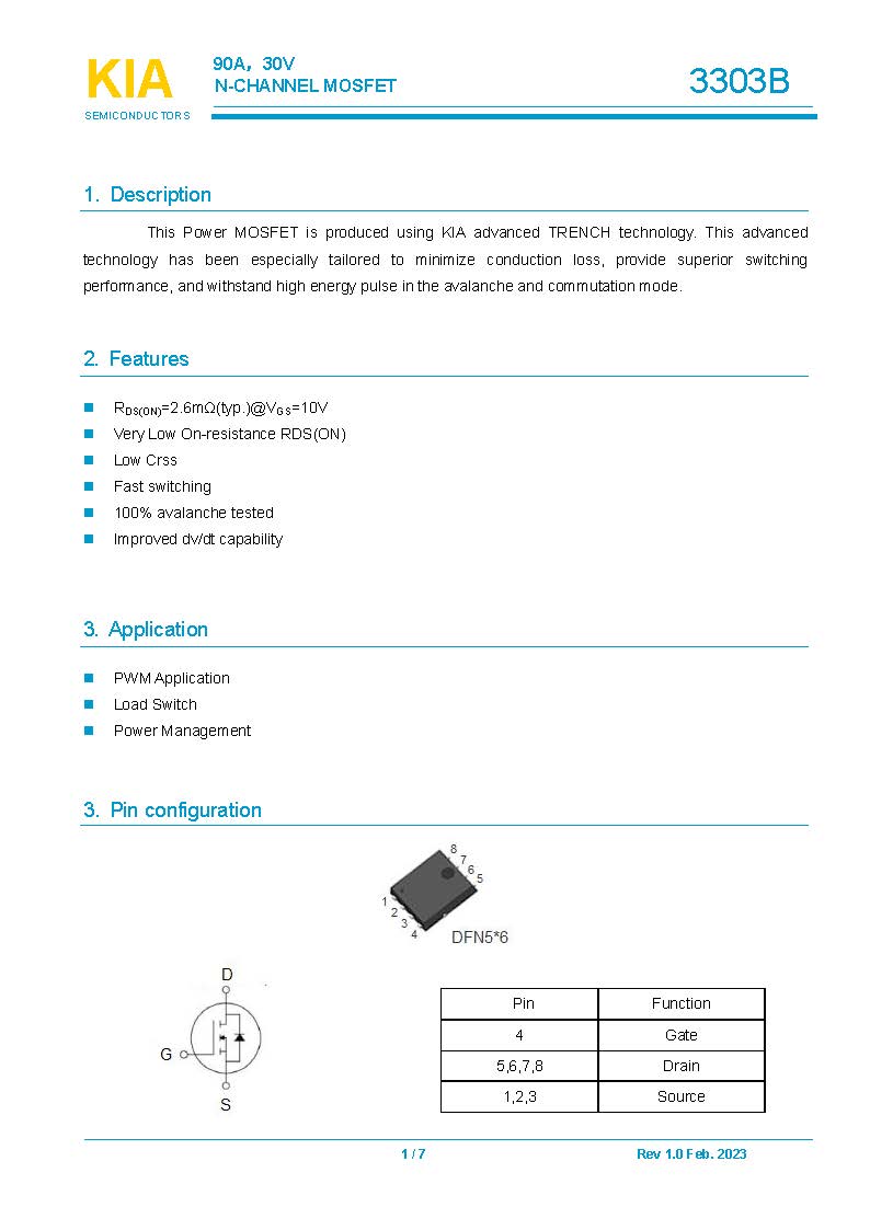 參數: ID(A): 90 BVDSS(V): 30 RDS(ON): 2.6 Qg(nC): 70 Package: DFN5*6