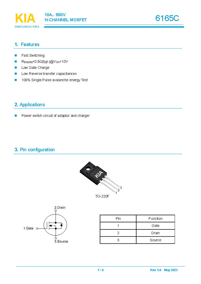 參數(shù): ID(A): 10 BVDSS(V): 650 RDS(ON): 0.8Ω Qg(nC): 35 Package: TO-220F