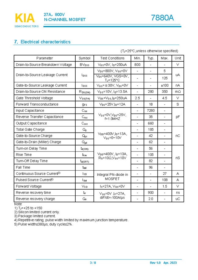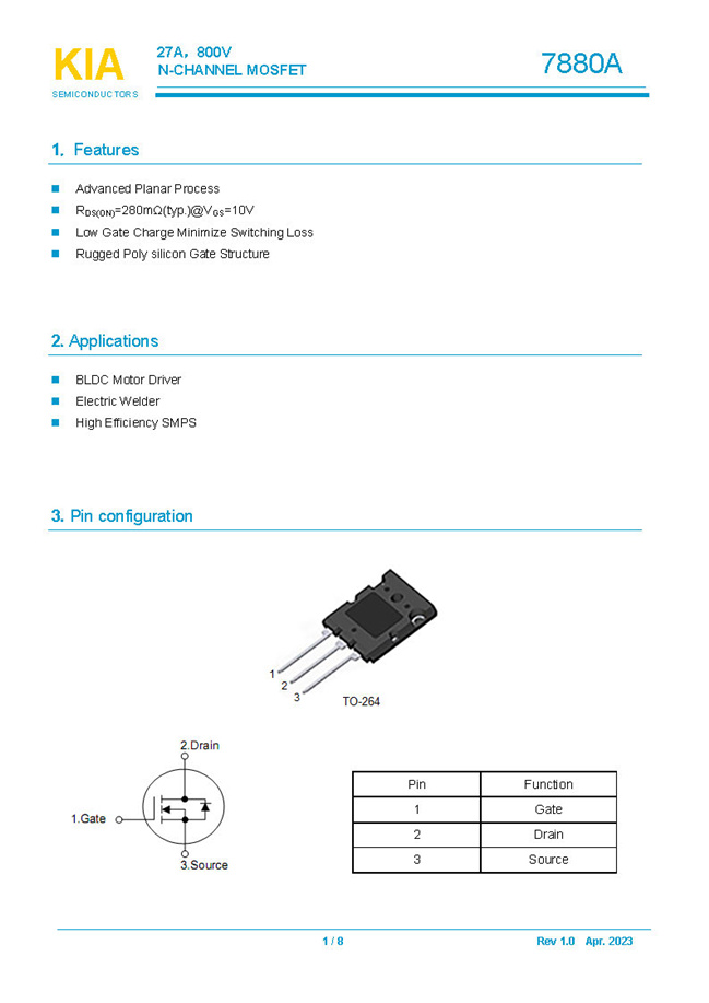 參數(shù): ID(A): 27 BVDSS(V): 800 RDS(ON): 280mΩ Qg(nC): 185 Package: TO-264