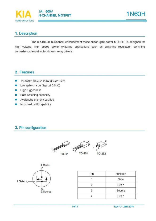 參數(shù): ID(A): 1 BVDSS(V): 600 RDS(ON): 11.5 Qg(nC): 6.2 Package: TO-01、TO-251、TO-252